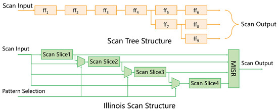 Donglikar utilized heuristic algorithms to reorder scan cells to enhance the fault coverage of the broadcast scan mode [77]. Pandey introduced an additional broadcast scan method and proposed a reconfiguration method to improve the compression efficiency of testing [78]. To simultaneously enhance the compression efficiency and fault coverage of testing, Gupta proposed a new layout and routing method for the broadcast scan mode [79]. Subsequently, Wang made improvements for channel delay faults under the broadcast mode [80]. In light of the limitations of the physical location and layout of scan cells, Banerjee optimized the wiring of the cells [81]. Considering that the physical location of scan cells is fixed before scan vector input, the above reconfiguration and optimization methods can effectively improve compression efficiency but introduce the consumption of wiring resources. Therefore, some research scholars have made other design improvements around the Illinois scan structure, including multi-fan-in optimization [82], pin optimization [83], RTL-level optimization [84], and low-power optimization [85].