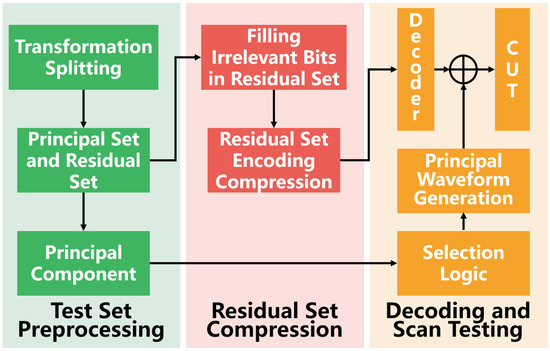 In recent years, to further enhance the efficiency of encoding compression, researchers have conducted preprocessing of test data based on spectral analysis. In test compression, spectral analysis is used to extract key test vector information components that determine fault coverage from the test vectors. Researchers have found that high-quality test vector sets exhibit characteristics related to the spectrum. By performing preprocessing based on spectral analysis, it is possible to generate test sets with high fault coverage while effectively reducing the amount of test data, achieving test compression. In practical applications, Yogi [100] proposed the use of Walsh–Hadamard transform for digital circuit analysis, which can detect fixed faults in circuits. Giani applied this transformation to the Built-In Self-Test (BIST) and ATPG for timing circuits [31]. Yogi applied spectral analysis to test vector preprocessing at the RTL (Register Transfer Level) [32]. Subsequently, Yogi completed test compression for fixed faults [101] and transition faults [102] in microprocessor testing. In 2010, Yogi extended the applicability of this method to very large-scale digital circuits, demonstrating that the Walsh–Hadamard transform can effectively analyze the principal components and residual components in the test set, and the inverse transform can recover the principal components into the original test vectors [100] (Figure 6).