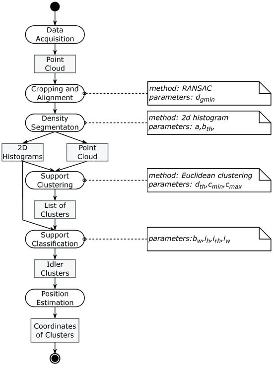 The proposed method for identifying the positions of idler frames in the image from 3D LIDAR consists of several stages, illustrated in Figure 2.