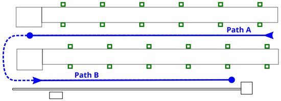The experiment comprised two runs, designated as Path A and Path B. The scheme of the experiment location is depicted in Figure 3. Illustrative images of the robot path and the conveyors with marked idler supports to be detected are presented in Figure 4.