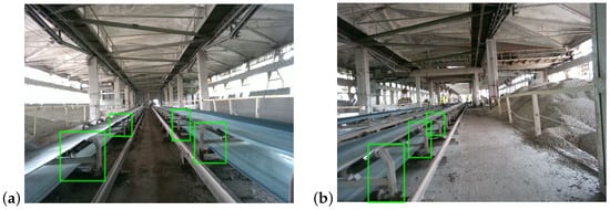 Images of the experiment location. (a) Path A. (b) Path B. Green rectangles mark the idlers’ supports to be detected.
