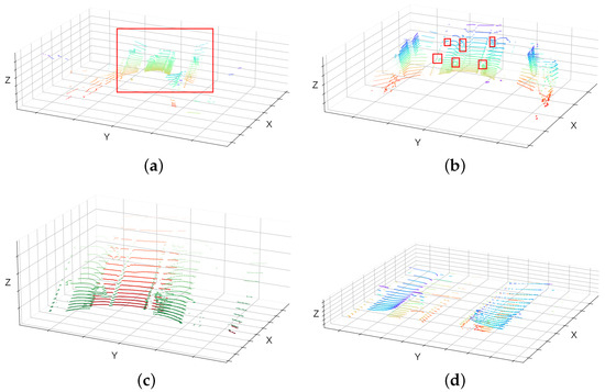 Transformation of a point cloud in preprocessing stage. (a) Original image from the LIDAR sensor. The red rectangle indicates the area with conveyors. (b) Point cloud with distant points clipped. The boxes show the location of idler supports. (c) The results of the RANSAC algorithm—the ground points marked in red. (d) Aligned point cloud with ground removal.