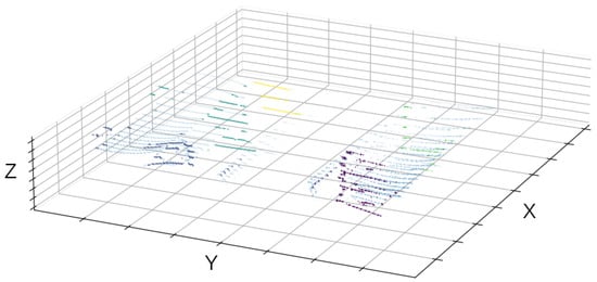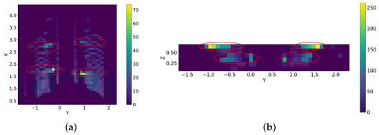 To exploit this property, the proposed solution uses 2D histograms representing the density of points. The histogram is constructed by a parallel projection of points onto a plane along a selected line. This plane is partitioned into a grid with square cells of size a and each cell in the histogram is associated with the number of points within it. Since the analyzed point cloud is the result of the alignment in the previous stage, the 3D points are projected along the main axes. Specifically, two projections are used: the top one along the Z axis and the front one along the X axis of the robot. The resulting 2D histograms are denoted as and , respectively. The cell of a histogram is given by