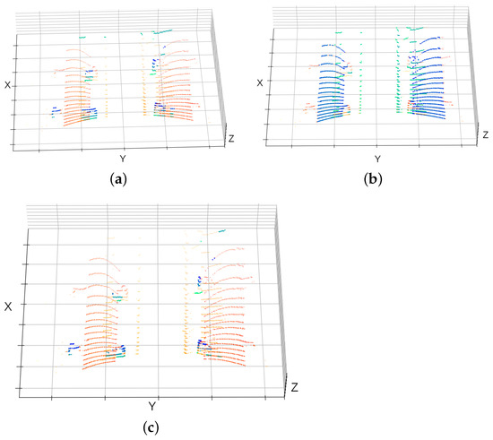 The platform carried a measurement module containing several sensors. That included an RGB and depth camera, a thermal imaging camera and 2D and 3D LIDAR sensors. However, for the needs of this study, only the data from the 3D LIDAR sensor were used. The 3D LIDAR sensor used in the experiment was Velodyne Puck. The sensor belongs to a popular type of spinning LIDAR sensors using the time-of-flight (ToF) method for the measurement of distance. The sensor uses a spinning array of 16 pairs of infrared (IR) lasers and detectors. Each pair measures distance within a full angle on a single cone’s surface, with measurement surfaces vertically separated by an angular distance of 2°. As a result, the field of view of the sensor is 30° vertically (from −15° to 15°) and 360° horizontally with angular resolutions 2° and 0.1–0.4°(depending on settings), respectively, and a measurement range up to 100 m. The sensor returns measurements of up to 300,000 points per second in the Single Return Mode that was used in the experiment. The transformations of measured distances to the point cloud coordinates were performed by the ROS driver of the LIDAR sensor.