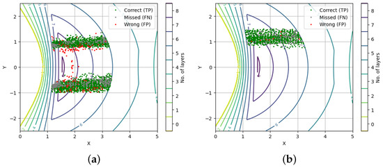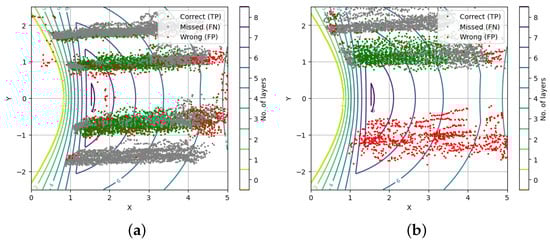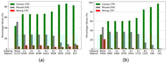 It may be observed that the areas with the number of active channels of four or less have only a minimal influence on the results. Starting from regions of interests restricted to five or more active channels, the number of objects decreases, but the percentage of correct detection grows. The biggest change is observed when limiting output to the areas of six and more active channels. Further restrictions have a smaller influence, especially for Path A and, at the same time, substantially decrease the number of objects in the region of interest. Figure 13 presents the distribution of the detection results for the region of interest limited to six or more active channels, clipped to the first row of supports, i.e., between the robot path and the conveyor’s belt.