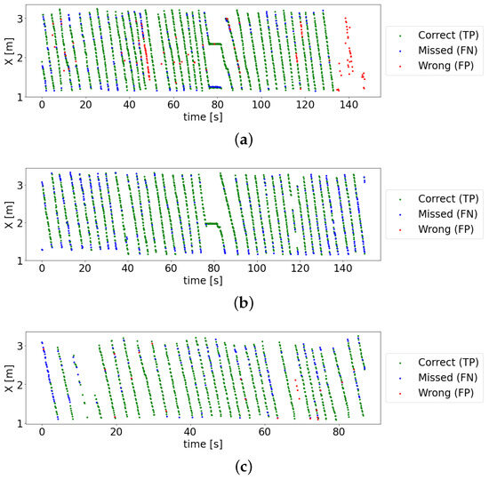 Apart from the summary of results, the detection quality over time can also be tracked. Figure 14 shows X locations of the objects within the region of interest, with color indicating the correctness of detection. For clearer visualization, the plots for objects on the left and right sides of the robot were separated.