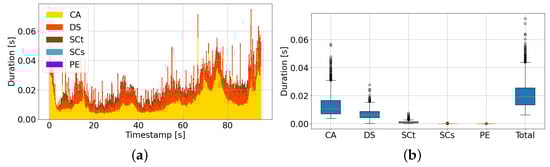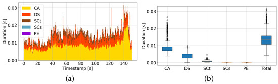 Duration of processing stages along Path B. (a) For each scan along the trajectory. (b) Box plots of the duration of stages.