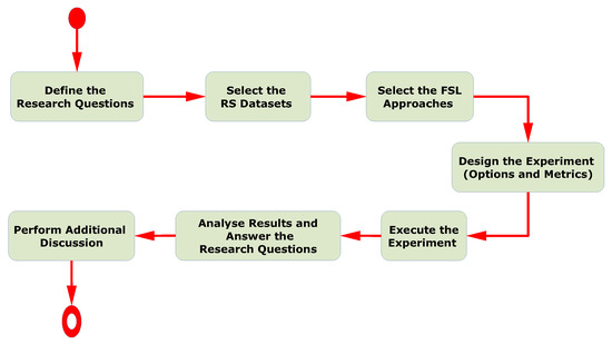 Figure 2 presents the workflow (activity diagram) of the method proposed for this study. The first step is to define the research questions in a way that analyses topics not yet addressed in the context of FSL for scene classification in RS images. The selection of proper RS datasets followed by the choice of some suitable and recent FSL approaches are the next activities. The experiment design with all the established options, as well as the selection of metrics (it can be a single metric too), are the next steps. The analysis of the results of the executed experiment, the answers to all research questions, and the conduct of an additional discussion conclude the method proposed in this work. The next sections will describe all these activities in detail.