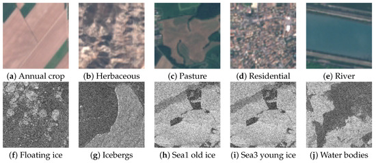 This section briefly describes the six RS scene classification datasets selected for this research. The number of unseen classes (K-way) during the inference phase was varied. EuroSAT [47] and XAI4SAR [48] were used with a 2-way setting, which is a low number of unseen classes during the inference phase. Sentinel-2 images were used to create EuroSAT, a dataset encompassing 13 spectral bands and featuring 10 classes, with a total of 27,000 labelled and geo-referenced images. The resolution of the images (patches) is 64 × 64 pixels. XAI4SAR consists of Sentinel-1 SAR image patches, including both single look complex (SLC) and ground range detected (GRD) products. Seven sea-ice types are annotated, with GRD image patches having a resolution of 256 × 256 pixels. Additionally, a Gaofen-3 SAR scene covering a large urban area was used, with seven land use and land cover (LULC) classes annotated. Figure 3 presents samples of some classes from the EuroSAT and XAI4SAR datasets.