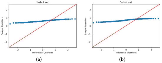 To answer RQ_2, the number of epochs during training was varied as follows: 10, 50, 100, and 200 epochs. Thus, we can grasp an idea about the relationship between the number of epochs used during training and the number of unseen classes during inference. As for RQ_3, we obtained the values of the metric for all 1-shot tasks, considering all datasets and the number of epochs, and compared them to the respective values obtained for the 5-shot tasks. Then, we applied the Shapiro–Wilk test with a significance level α = 0.05 to check data normality. A quantile–quantile (Q-Q) plot was used to confirm the results due to the Shapiro–Wilk test. Since in all cases the data happen to be not normal (see Section 4), the non-parametric Wilcoxon test, with the alternative greater and significance level α = 0.05 , was applied.
