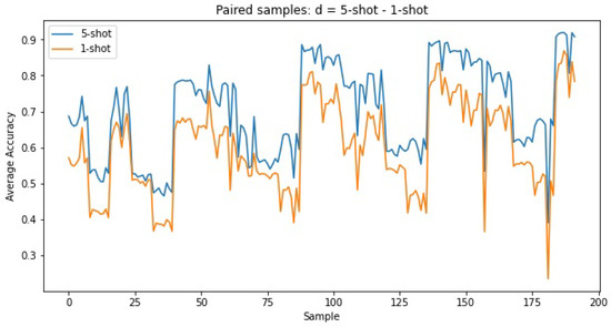 The application of the non-parametric Wilcoxon test, with the alternative greater and paired samples d = 5-shot − 1-shot, gave the following results: statistic = 18,528 and p-value = 1.466873 × 10 33 . The mean value of the 5-shot set is 0.703370 while for the 1-shot set is 0.602152. Thus, we conclude that there is strong statistical evidence that the values in the 5-shot set are consistently and significantly greater than those in the 1-shot set. Figure 7 presents the average accuracies for all samples from the 5-shot and 1-shot sets.