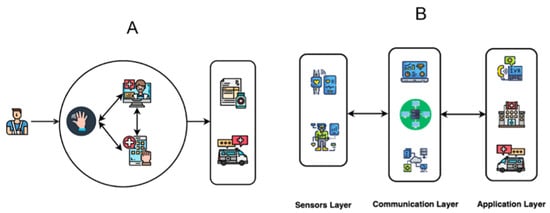 Internet of Medical Things (IoMT) refers to the integration of IoT (Internet of Things) technology into the healthcare sector []. This term indicates the use of connected devices, such as wearable sensors and smart medical equipment, to collect and exchange data to improve clinical decision making [,] (Figure 1A). Access to near-real-time data may alert users of emergency alterations in biomarkers, enabling timely medical interventions []. Moreover, IoMT represents an opportunity for empowering patients to monitor their own health data while potentially reducing patient care costs []. The combination of IoMT and telemedicine has the potential to improve patient care by allowing remote monitoring []. This scenario eliminates costly in-person visits, leading to more efficient and cost-effective care [,]. However, IoMT faces some challenges. For example, the data integration between IoMT networks and Electronic Medical Records (EMRs) can be difficult to establish [,]. As IoMT devices generate large volumes of data in various formats, the lack of standard protocols complicates integration into EMR systems. Furthermore, differences in technology infrastructure across healthcare organizations and varying data-sharing regulations contribute to these difficulties. Privacy concerns and strict compliance requirements impose additional constraints on data transfer and storage, creating barriers to full integration [,,,].