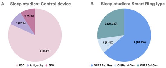 (A) Sleep studies: control device characteristics. PSG: polysomnography. EEG: electroencephalography. (B) Sleep studies: smart ring characteristics. Gen: generation.