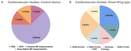 (A) Cardiovascular studies: control device. PSG: polysomnography. ECG: Electrocardiogram. BP: Blood Pressure. (B) Cardiovascular studies: smart ring type. Gen: generation.