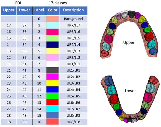 The data were acquired from the Montreal dental lab Kerenor. The dataset consists of 1006 upper and 984 lower arches. The dataset was segmented by dental technicians and dental interns using a commercial segmentation software. We used the FDI (Federation Dentaire Internationale) notation system for labeling teeth. However, we also applied a 17-class notation for model training and inference (0 for gingiva, 1–14 for normal teeth, and 15, 16 for wisdom teeth). Both FDI and the 17-class notations are illustrated in Figure 1. Note that all colored dental arches were generated using Mesh Labeler (v.3.36) [36]. Our framework also utilized a 3-class segmentation model during pre-processing and post-processing to distinguish teeth from gingiva and preparations, if they exist, as follows (0: gingiva, 1: tooth, 2: preparation).