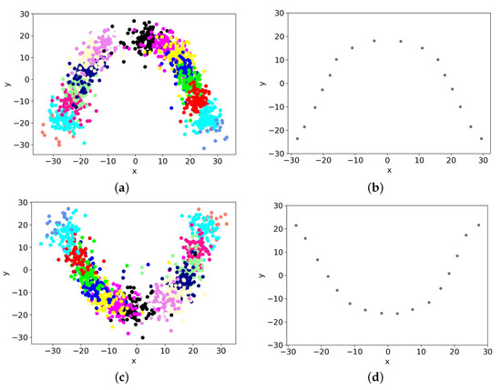 Determining teeth centroids of segmented arches. (a) Teeth centroids of upper arches, (b) Average upper teeth centroids, (c) Teeth centroids of lower arches, (d) Average lower teeth centroids. Different colors correspond to different teeth types.