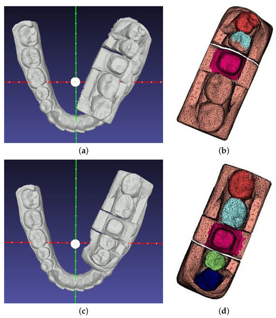 DSC as a segmentation metric has been widely applied for semantic segmentation of teeth [7]. But in the context of imperfect dental arch segmentation for crown generation, there are two concerns to be highlighted. First, DSC always overestimates the average performance because all absent classes obtain a score of one. For a partial arch with less than eight teeth, the average class-wise DSC is always larger than 10/17 (≈0.588). On the other hand, DSC does not reflect the quality of the segmentation from a dentist’s point of view. In fact, we prefer mislabeled but appropriately segmented teeth to partially segmented teeth with correct labels. Figure 15 shows two examples: first with a smaller averaged DSC (a) ground truth and (b) prediction, but the result is not bad because shifting labels is easier to correct than repairing mixed labels. The second case, (c) ground truth and (d) prediction, presents with a larger DSC value but with two labels on one tooth. DSC is still an adequate metric to evaluate the performance of segmentation in general; however, the aforementioned concerns should be considered when analyzing the results during performance evaluation.
