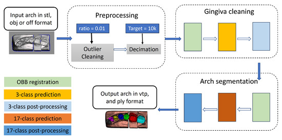 The use of machine learning algorithms in digital dentistry has significantly increased during the past few years [2,3,4]. A recent review on tooth segmentation from CBCT images reported issues related to the low amount of available dental data and non-uniformity of evaluation metrics [5]. The same challenges exist in segmentation of teeth from 3D surface scans. Moreover, to the best of the authors’ knowledge, published research on dental arch segmentation from 3D surface scans focused on full or perfect arch segmentation such as MeshSegNet [6,7], Dental Arch Prior-assisted 3D Tooth Instance Segmentation (DArch) [8], dynamic graph convolutional neural network (DGCNN) [3], and tooth segmentation using generative adversarial networks [9]. Therefore, it is important to develop an automatic, generic, and accurate framework capable of efficiently segmenting dental arches with imperfections.
