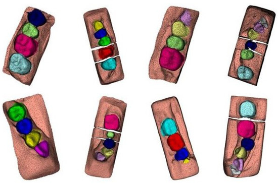 Figure 13 shows examples of representative qualitative results. We do not put the ground truth to save space, particularly because most of the cases presented high DSC scores. We can observe that our trained model can segment the wisdom teeth and properly remove the missing tooth. Because we registered the antagonist with the help of the master registration matrix by default, the wall-time needed for segmenting a pair of decimated (10k) and aligned master/antagonist was about 25–30 s.