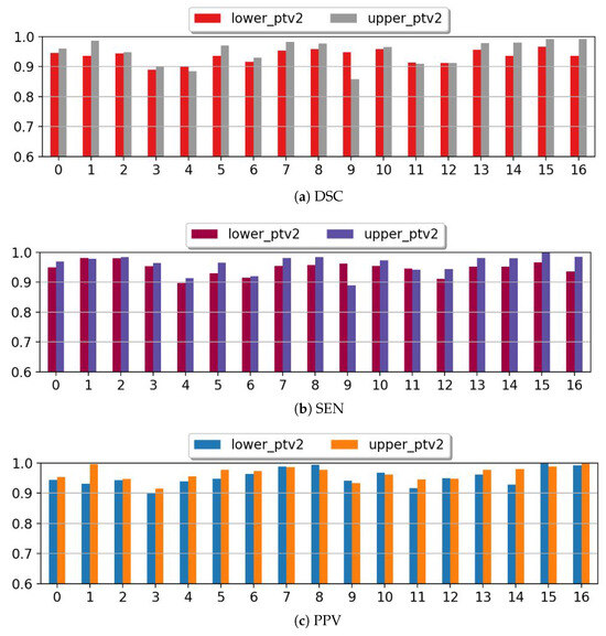 Class-wise performance with default framework settings in terms of three evaluation metrics: (a) DSC, (b) SEN, and (c) PPV of a test set with 30 upper and 30 lower partial arches.