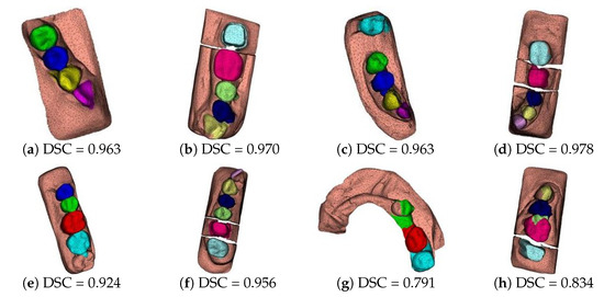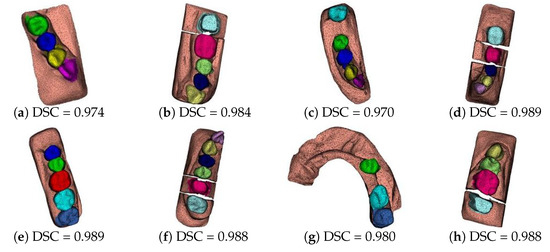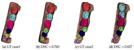 As a baseline, we trained the well-known MeshSegNet [6] with similar pre-processing and dataset. Figure 14 shows the segmentation results for the same cases illustrated in Figure 13. We can observe that PTV2 outperforms MeshSegNet in terms of DSC for all cases. The segmentation accuracy for PTV2 is higher than that of MeshSegNet with values of percentage increase ranging from 1.1% to 15.5%. One explanation is that the transformer-based model PTV2 is much larger than the graph convolution network-based MeshSegNet in size. The number of parameters of PTV2 is 11.4 M, whereas that of MeshSegNet is 1.8 M. Another explanation is that the self-attention, group attention, and appropriate position encoding allow PTV2 to achieve a higher accuracy for large and complex 3D point cloud representation compared with MeshSegNet.