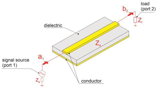 Microwave transmission lines enable the transmission of high-frequency signals from a source to the load. In the case of wearable wireless systems, the signal source is the transmitter output and the load is the textile antenna, as presented in Figure 1. Each of these elements is characterized by its impedance, as shown for the case of the microstrip line in Figure 2, where the source of the signal a1 is connected to port 1 of the line, while the output signal b2 at port 2 is connected to the load (textile antenna, potentially).