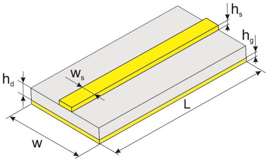 Figure 3 illustrates a microstrip line’s geometry. A thin layer of conducting material, of thickness hg, is placed on the lower surface of a dielectric material of thickness hd and permittivity εr. On the upper surface of the dielectric, there is a thin strip of conducting material of width ws and thickness hs, while L is the length of the line.