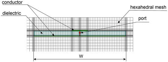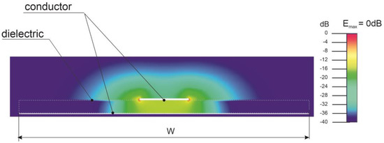 To design a knitted microstrip transmission line that operates in a 2.4 GHz band, computer simulations were applied in the CST Studio Suite program (2022.05 release). Simulations were made in a time domain using the Finite Integration Technique (FIT) [43]. This allowed us to include in the simulations the significant thickness of the strip in relation to the dielectric. Figure 4 shows a cross-sectional view of the line model in which a complex structure of knitwear is approximated as the homogenous material. The knitted dielectric substrate is modeled as a lossy dielectric and characterized by a relative permittivity εr and loss tangent tan (δ). The conducting surfaces at the bottom of the dielectric and the strip are modeled as perfect conductors. In this model, hexahedral mesh was used, the size of which was automatically adjusted to the geometry of the model. The shortest edge of the mesh was 0.1 mm (in the region of the ground conductor) and the largest was 2.5 mm (in the free space region). The distribution of the module of electric field intensity in this structure is presented in Figure 5. In this case, the complex nature of this distribution in the area of the side walls of the strip, near the dielectric, is visible.