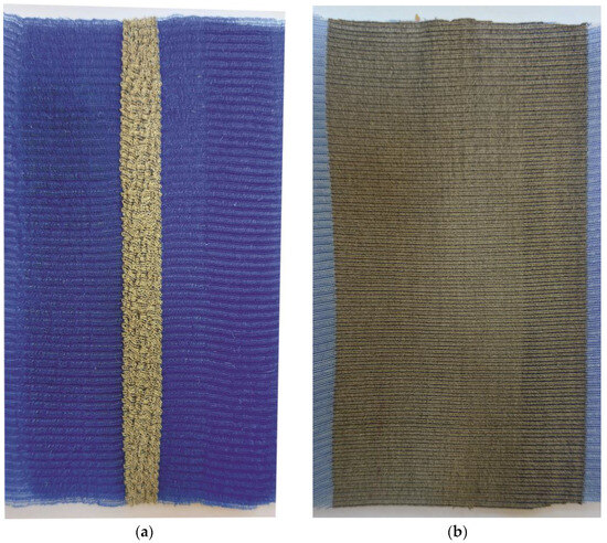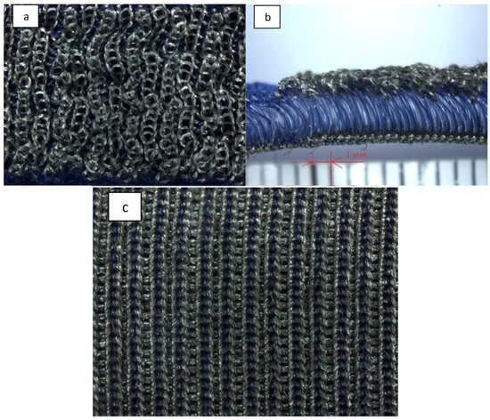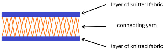 Innovative knitted commodities based on weft distance knitted fabrics are created on special machines called crochet machines; flat crochet machines or cylindrical machines can be used for this purpose [37]. The spacer knitted fabric technology allows for the production of textile materials with unique properties that cannot be obtained by any other methods (low specific gravity, high elasticity, appropriate thermoregulatory properties). It is worth noting that it is possible to design a layered structure in which each layer has different properties; these properties can be completely independent of each other or even divergent (e.g., one side of the material can absorb moisture and the other be hydrophobic) [38,39]. In one preparation stage, a material is made from three or more coils, which makes the manufacturing process itself relatively cheap and simple compared to other methods of creating spatial textiles.