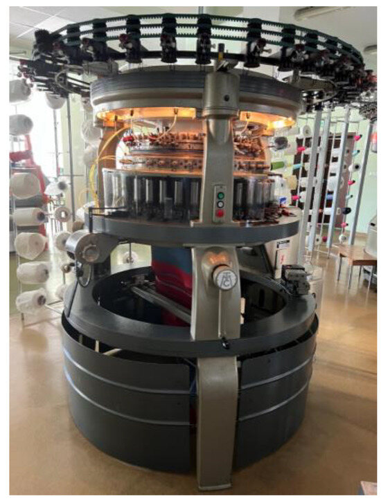 The microstrip transmission line was made using spacer weft knitting technology on a Mayer & Cie cylindrical crochet machine (Mayer & Cie, Albstadt, Germany), type OVJA 36. The machine had a needle number of 20 (E20), a cylinder with a diameter of 30 inches, and a needle pitch of 1.27 mm (Figure 9).