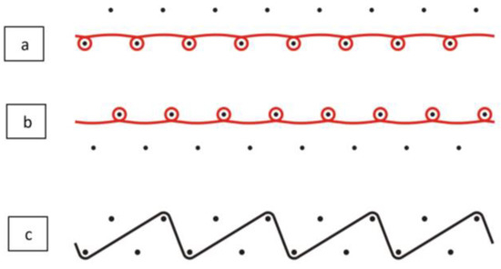 To fabricate the knitted transmission line, weft spacer knitted fabric technology was selected, as it provides the possibility of making the product using a small amount of raw material, directly from the coil, bypassing the processes of yarn preparation before production, such as rewinding or weaving. A model of 3D weft knitted fabric is made of two outer layers made with a basic weave (usually shaker stitch), bonded with a monofilament thread (separates the outer layers). The monofilament thread does not form loops: it is knitted in the form of take-up, keeping the outer layers at a distance from each other. The construction of the classic spacer knitted fabric is shown in Figure 8.