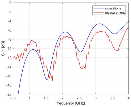 Using the measurement setup described above, the parameters characterizing the textile transmission line were measured. Figure 14 presents the measurement results of the S11 parameter module (in red). The corresponding simulation result (in blue), which exhibited the closest match, is superimposed on the measurement data. The best agreement was obtained for simulations with a substrate relative permittivity of εr = 1.5 and a dielectric loss tangent of tan (δ) = 0.15. Figure 15 shows the measurement results for the S21 parameter of the prototype line. In this case, as well, the closest simulation result, obtained for the same material parameters as for the S11 parameter, was superimposed on the measurement data.