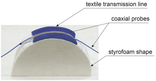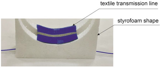 The transmission line presented in our paper is intended for wearable applications, where it may be subjected to bending due to the curvature of the human body. While twisting is less likely, bending along the longitudinal axis is a significant concern. To evaluate this, we conducted bending tests on a cylindrical surface with a 100 mm radius. The experimental setups for convex and concave bending are depicted in Figure 16 and Figure 17. A Styrofoam form was utilized to introduce deformation into the prototype textile line. This choice of material was based on the need to minimize measurement artifacts. Styrofoam’s electrical properties (at 3 GHz, εr = 1.03, tan (δ) = 0.0001 [40]), being comparable to those of air, ensured that the fixture would have a negligible impact on the measured parameters. The results of these measurements, specifically the impact on the S11 and S21 parameters, are presented in Figure 18 and Figure 19.