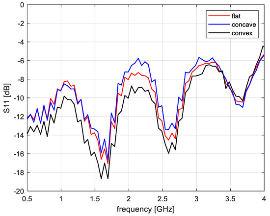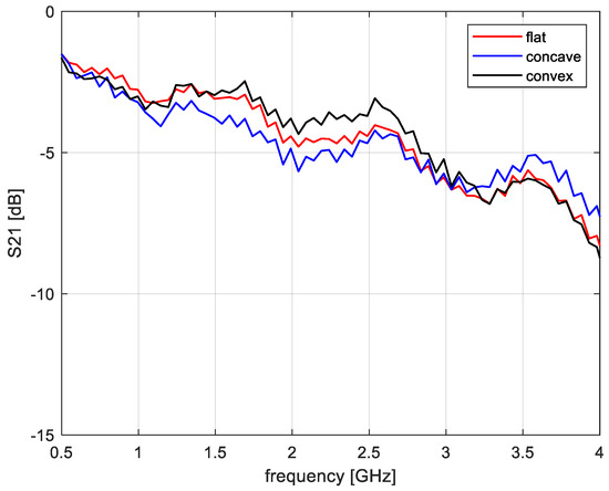 Figure 18 and Figure 19 demonstrate that bending the transmission line with a radius of curvature of 100 mm has a negligible impact on its electrical performance. Interestingly, when using a convex fixture, a minor improvement in impedance matching and a reduction in attenuation were observed at 2.4 GHz. This phenomenon could be attributed to a slight reduction in the thickness of the dielectric substrate. These results indicate that further optimization of the transmission line design by varying the dielectric substrate thickness may yield beneficial outcomes.