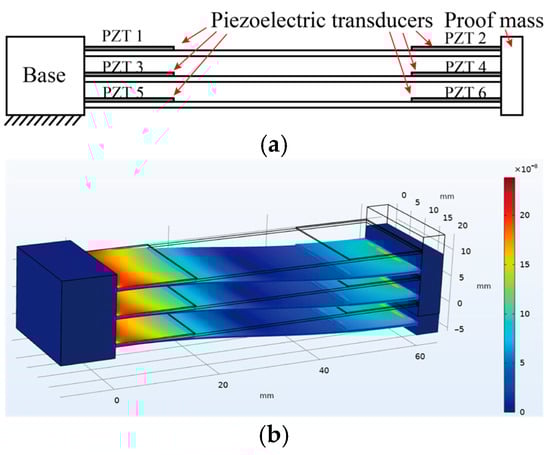 It can be seen that each section of the cantilever is undergoing an S-shaped bending motion, as shown in Figure 2. The proof mass introduced additional constraints, ensuring that the free ends of the cantilevers experienced no rotation, which would result in significant bending moments. Hence, the torques in the longitudinal direction of the piezoelectric cantilever were decreased to zero and then increased from the free end to the fixed end of the beam. In other words, both the fixed and free ends of the beam undergo strain concentrations. As a result, piezoelectric transducers were mounted at the tip of the beam. This would further increase the system-level stiffness of the cantilever, thereby raising the resonant frequency to match that of the transformer substation. Piezoelectric transducers can be attached at both the fixed and free end of the beam to increase the power output.