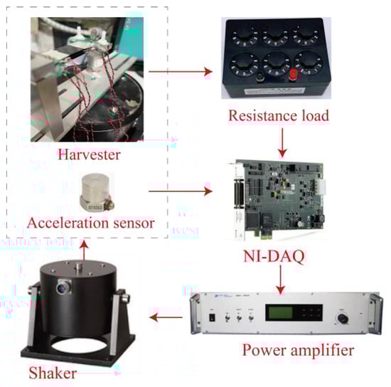 The experimental setup of the proposed multiple-layer PEH is shown in Figure 3. In this research, we mainly focused on illustrating the features of the proposed harvester experimentally. Ghodsi developed a detailed analytical electromechanical coupling model in Ref. [31]. The PEH contained three piezoelectric cantilevers with connections at both the fixed and free ends. The spring steel substrate of the piezoelectric cantilever had dimensions of 75.18 × 20 × 0.16 mm3. Six piezoelectric transducers (15 × 20 × 0.2 mm3) were glued to the root and free end of the cantilevers using epoxy resin DP460 (3M, St. Paul, MN, USA). The lead zirconate titanate-5 piezoelectric transducers were purchased from Jiayeda, Co., Ltd., Changde, China, with Young’s Modulus of 106 GPa and piezoelectric coefficient d31 = −171 pC/N. The proof mass was attached at the free end of the PEH. The proof mass was made of permanent magnet blocks. Permanent magnets were glued onto the cantilever as the primary proof mass. Additional permanent magnets were attached to the primary one to tune the natural frequency of the harvester to the operational frequency of 100 Hz. As the permanent magnets would provide attractive force to each other, the additional permanent magnets were added to the fixed location at the free end of the cantilever. The number and sizes of the magnets were carefully selected to adjust the resonant frequency of the model to 100 Hz. A 200 N shaker was adopted to provide the base-movement excitations. The root mean square (RMS) output voltages of the piezoelectric transducers were measured by a NI-DAQ device (PCIe6343) (National Instruments, Austin, TX, USA) with a sampling frequency of 20 kHz. In addition, the amplitude of the base-movement was measured by an accelerometer.
