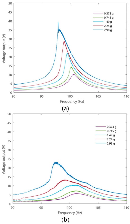 Figure 5 shows the open circuit voltage output under forward and backward frequency sweeping. The voltage outputs of the piezoelectric transducer on the first layer at the fixed end (PZT1) under excitations with different amplitudes are presented for illustration. The forward frequency responses are shown in Figure 5a, where the frequencies of excitations sweep from low to high. It can be seen that the harvester reached its RMS open circuit voltage output of 14.28 V under 0.745 g amplitude excitation in the forward frequency responses, as shown in Figure 5a. An increase in the amplitudes of excitation can effectively enhance the voltage outputs. For instance, the peak output of the PEH is 29.17 V under an excitation of 2.98 g. Additionally, the proposed PEH exhibits a softening effect under a large amplitude excitation of 2.98 g, i.e., the voltage outputs lean towards the left under a large amplitude excitation with a sudden decrease at 98.88 Hz in the forward frequency sweeping. This phenomenon can be attributed to the nonlinearity of the additional constraints, which led to uneven stress in the three beams, since the three cantilevers are assembled in parallel. In addition, the backward frequency responses are shown in Figure 5b, where the frequencies of excitations sweep from high to low. The frequency responses under forward and backward responses show difference with each other due to the exitances of nonlinearity. The voltage outputs in this scenario are smaller than those under forward frequency sweeping. The high voltage output can be achieved by properly selecting the frequency sweeping direction in a real application. Additionally, an increase in the amplitudes of excitation can effectively enhance the voltage outputs. Nevertheless, the PEH has large amplitude voltage outputs around 100 Hz that could power the wireless sensor node.