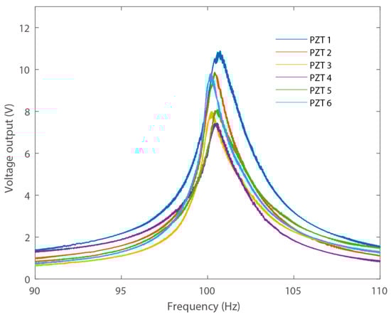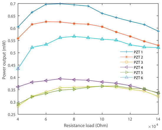 To evaluate the power output capability of the proposed PEH, each of the piezoelectric transducers were connected to individual resistance loads [32,33,34,35]. The power output responses were measured under a constant excitation of 0.745 g, with different resistance loads around 100 Hz. The resulting voltage across the load resistance was measured and recorded, as shown in Figure 7.