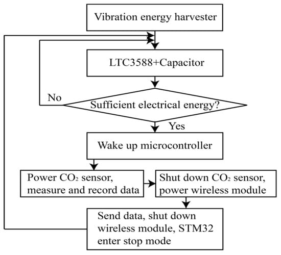 The control algorithm of the self-powered wireless sensor node is shown in Figure 8. Note that the PEH provides limited electrical energy, and the STM32 microcontroller will be in stop mode most of the time. The microcontroller will wake up when the LTC-3588 outputs sufficient energy. Here, the wireless sensor node requires a 3.3 V power supply. Additionally, the LTC-3588 will output 3.3 V when the voltage in the energy storage capacitor is around 4.73~5.37 V according to the datasheet. Serial ports of the microcontroller were used to connect the wireless transmission module to the register. When there is sufficient energy in the capacitor, the procedures of CO2 measurement and wireless data transmission will be triggered. Firstly, the CO2 sensor will be powered on, and the data will be recorded. Then, the sensor will be shut down for power saving, and the wireless module will be powered on for the wireless data transmission. Note that the sensor and wireless data transmission modules will still consume energy when connecting to power sources, even if they are not in working conditions. Four GPIO ports were connected in parallel to power the sensor and wireless modules. The modulus will be completely shut down when sensing and data transmission tasks are not required. It is worth mentioning that multiple time delay functions were tested and integrated for the initialization and operation of the sensing and wireless transmission modules during the program debugging.