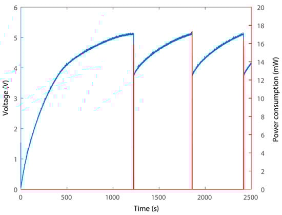 Figure 9 shows the voltage of the capacitor, representing the process of charging, as well as the power consumption of the wireless sensor node. The charging process starts from a state of zero electrical energy storage in the capacitor. It can be deduced that it takes about 1220 s to charge the capacitor for the first data measurement and data transmission. It is worth noting that in a previous study, it took 8000 s to charge the capacitor and power a similar wireless sensor node with a single piezoelectric transducer PEH [40]. In other words, the advantages of multiple piezoelectric cantilevers with enhanced power output capabilities could be confirmed. In addition, a one-time recharging takes about 630 s in the following cycles. The voltage drop from 5.14 V to 3.76 V, which represents the power consumption of the processes of powering up, sensor data reading, and wireless data transmission. In this research, 16000 μF large capacitors were adopted, and thus, the wireless sensor node will consume 0.0983 J per sensing cycle, with a power consumption of 16~18mW. In addition, choosing a larger capacitor would provide more energy for each cycle of sensing and data transmission. And the energy storage capacitor starts charging again to enter the next cycle. Notably, the recharging time is sufficiently short for regular CO2 monitoring in a transformer substation. Notably, the time for recharging would be further shortened by reducing the power composition of the node.