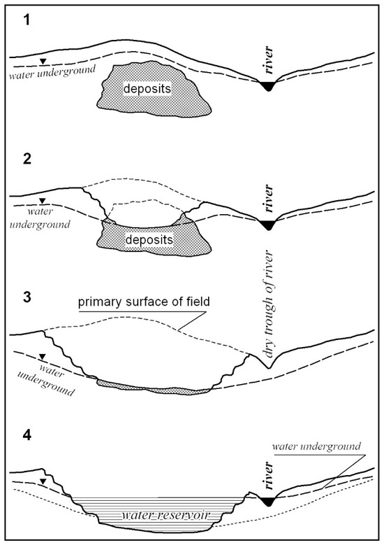 Stages of the formation of excavation reservoir, according to Molenda (2011) [10]. 1—situation before exploitation, 2—situation during exploitation above the water table, 3—situation during exploitation below the water table, 4—situation after the exploitation cessation.