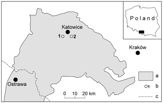 Location of the research area: a—Upper Silesian Coal Basin (GZW), b—Location of the studied objects: 1—Gliniok and Grunfeld, 2—Hubertus I and II, c—state border between Poland and the Czech Republic.