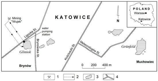 Localisation of investigated reservoirs Gliniok and Grunfeld: 1—coal mine; 2—direction of mine water discharge; 3—anthropogenic reservoirs; 4—roads.
