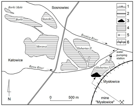 Localisation of investigated reservoirs Hubertus I and II: 1—rivers, 2—roads, 3—delta of mine sediments, 4—post-exploitation reservoirs, 5—mine waters pipeline, 6—railway line.