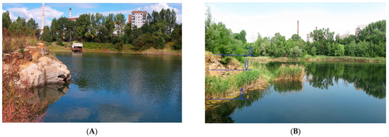 The Gliniok reservoir: (A)—in 2010, (B)—currently (1—maximum water level when the reservoir operated as a settling reservoir, 2—water level in 2010 after the end of operation, 3—current water level.