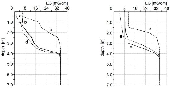Electrical conductivity (EC) profiles of the Gliniok reservoir: a—Autumn, 2008; b—Spring, 2008; c—Autumn, 2009; d—Spring, 2009; e—Winter, 2008; f—Winter, 2009; g—Summer, 2008.