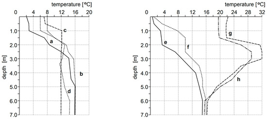 Temperature profiles in the Gliniok reservoir: a—Autumn, 2008; b—Spring, 2008; c—Autumn, 2009; d—Spring, 2009; e—Winter, 2008; f—Winter 2009; g—Summer, 2008; h—Summer, 2009.