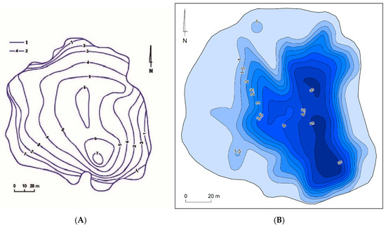 Mine water settling basins were studied following the methodology of Gutry-Korycka and Werner-Więckowska [16]. A Lowrance Elite Ti2 echosounder (Lowrance, Tulsa, OK, USA) integrated with a GPS receiver was used to obtain data on the depth of the reservoirs. The basins’ bathymetric plans were plotted using Reef Master 2.0. Their morphometric features were measured using a Tru Pulse 200 L laser rangefinder (Laser Technology, Inc., Centennial, CO, USA).