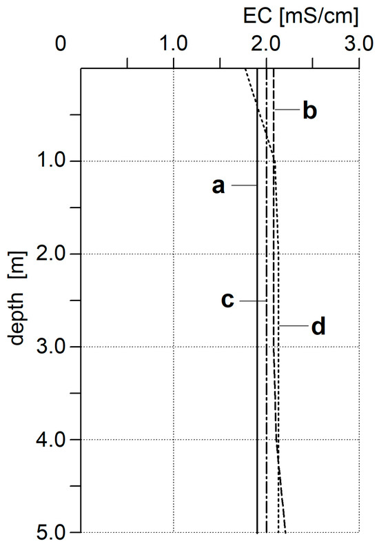 Electrical conductivity (EC) profiles of the “Hubertus I” reservoir: a—Autumn, 2023; b—Summer 2023; c—Spring, 2024; d—Winter, 2024.