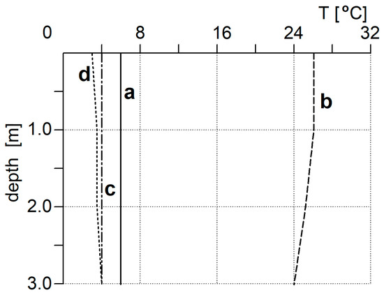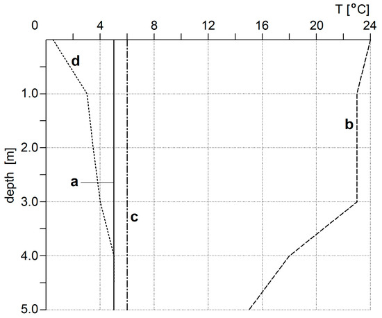 Temperature profiles in the “Hubertus I” reservoir: a—Autumn, 2023; b—Summer 2023; c—Spring, 2024; d—Winter, 2024.